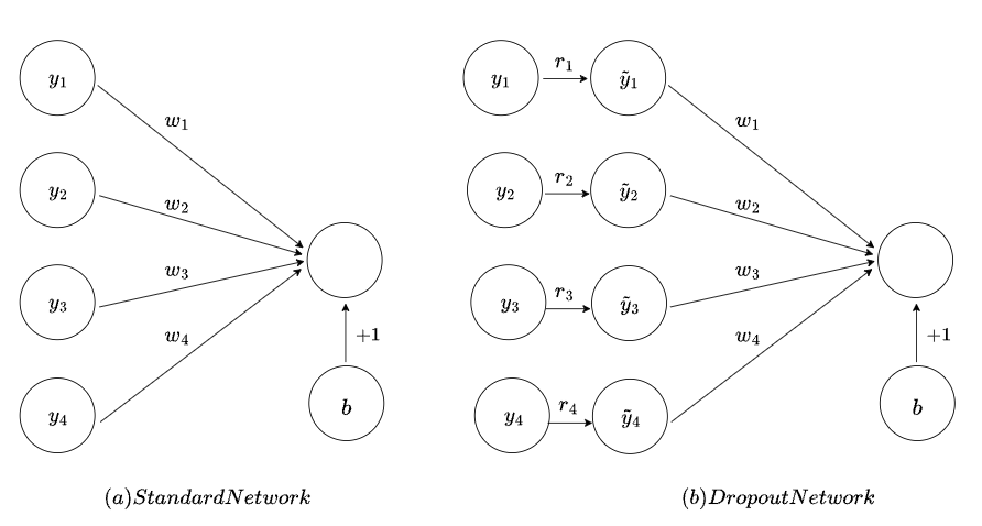 如上圖所示,在一般的 Neural Network 中,前一層的輸出 y 會直接與這一層的 Weight 相乘,並加上 Bias;若加上 Dropout 機制,會使得前一層的每一個輸出 y,都會再乘以一個 r 才會與這一層的 Weight 相乘,並加上 Bias。