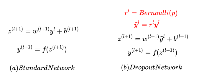 上圖是以數學算式呈現一般的 Neural Network 與加入 Dropout 機制的不同之處,可以發現其實只有多了紅色部分,也就是每一個 Neuron 都會從 Bernoulli Distribution 以機率 p 生成出 0、以機率 (1-p) 生成出 1。