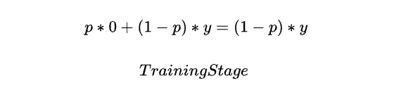 如上圖算式所示,在「訓練階段」受到 Dropout 機制影響下的 Neuron 有 p 的機率輸出會變成 0(停止運作),有 (1-p) 的機率輸出維持不變。因此,該 Neuron 的輸出期望值會是 (1-p) * y。