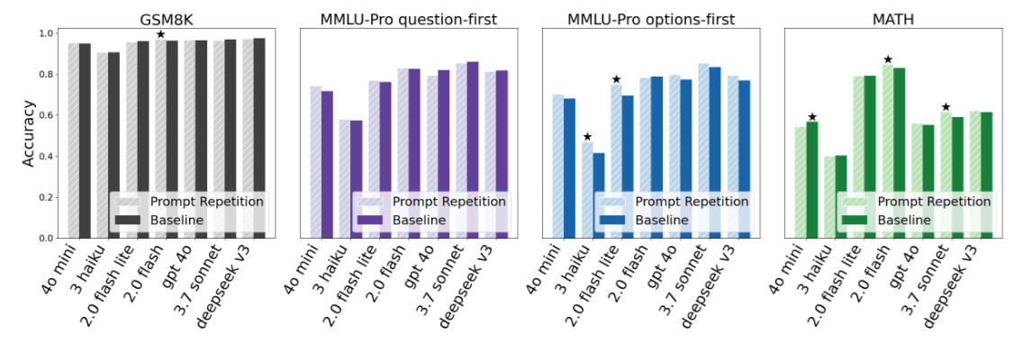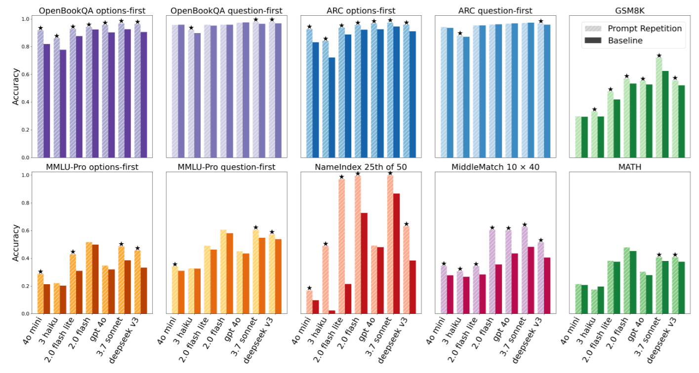 - Significance: This is extremely rare in the machine learning field. Usually, a trick might work for GPT but not for Claude. But Prompt Repetition spans across different model architectures and parameter scales.
