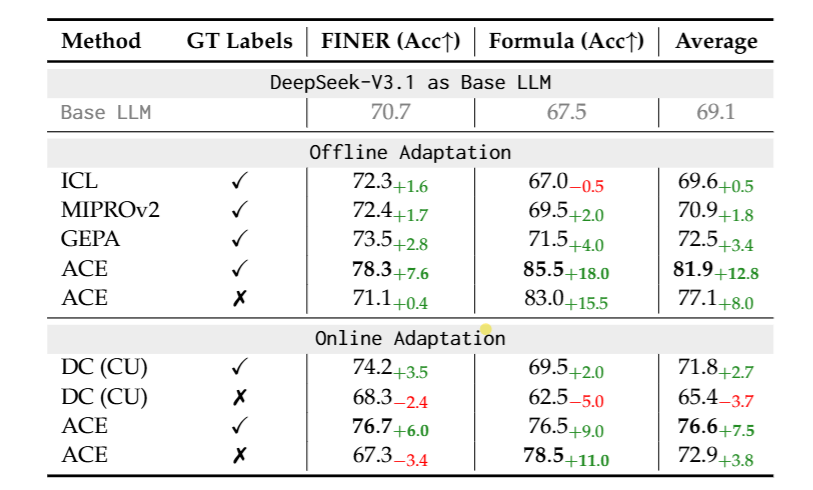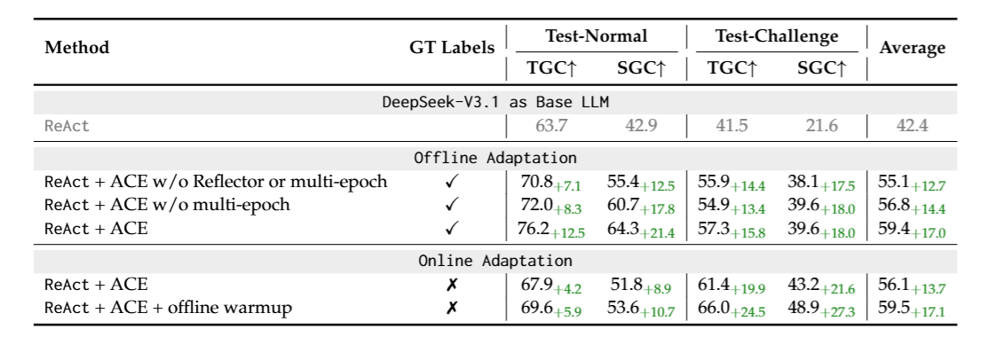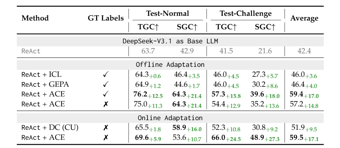 上表 Table 1 呈現的是 ACE 與 Baseline 方法在 AppWorld Agent Benchmark 上的表現,其中 “GT labels” 表示 Reflector 在從 Inference Trace 中萃取出 Insight 的過程中,可不可以看到 Groundtruth Label。從 Table 1 可以發現到不管在 Offline 與 Online 情境下,ACE 的表現都勝過其他 Baseline 方法!