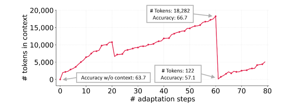 如下圖所示,LLM 在第 60 個 Adaption Step 時,突然將 Context 由原本的 18282 個 Token 縮減為 122 個 Token,讓整個系統的表現突然變差: