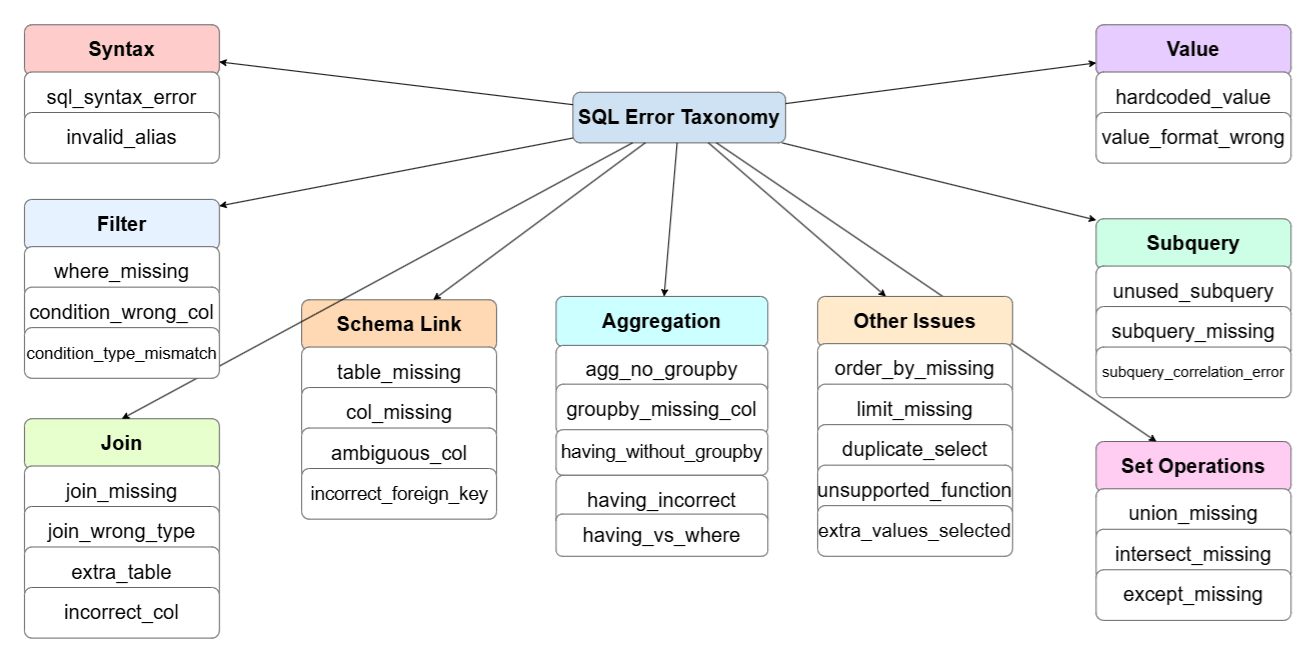Correction Plan Agent: 如果 SQL Code 的執行過程中有 Error 產生,則透過此 Agent 來產生如何修正 SQL 的計畫。值得注意的是,本篇論文特別強調,在這個 Agent 的 Prompt 中不只要要求 LLM 透過 Chain of Thought 的方式來產生修正計畫,還提供 SQL Error Taxonomy,進一步提升此 Agent 的表現。SQL Error Taxonomy 其實就是 SQL Code 中可能出現的 Error 種類,如下圖所示: