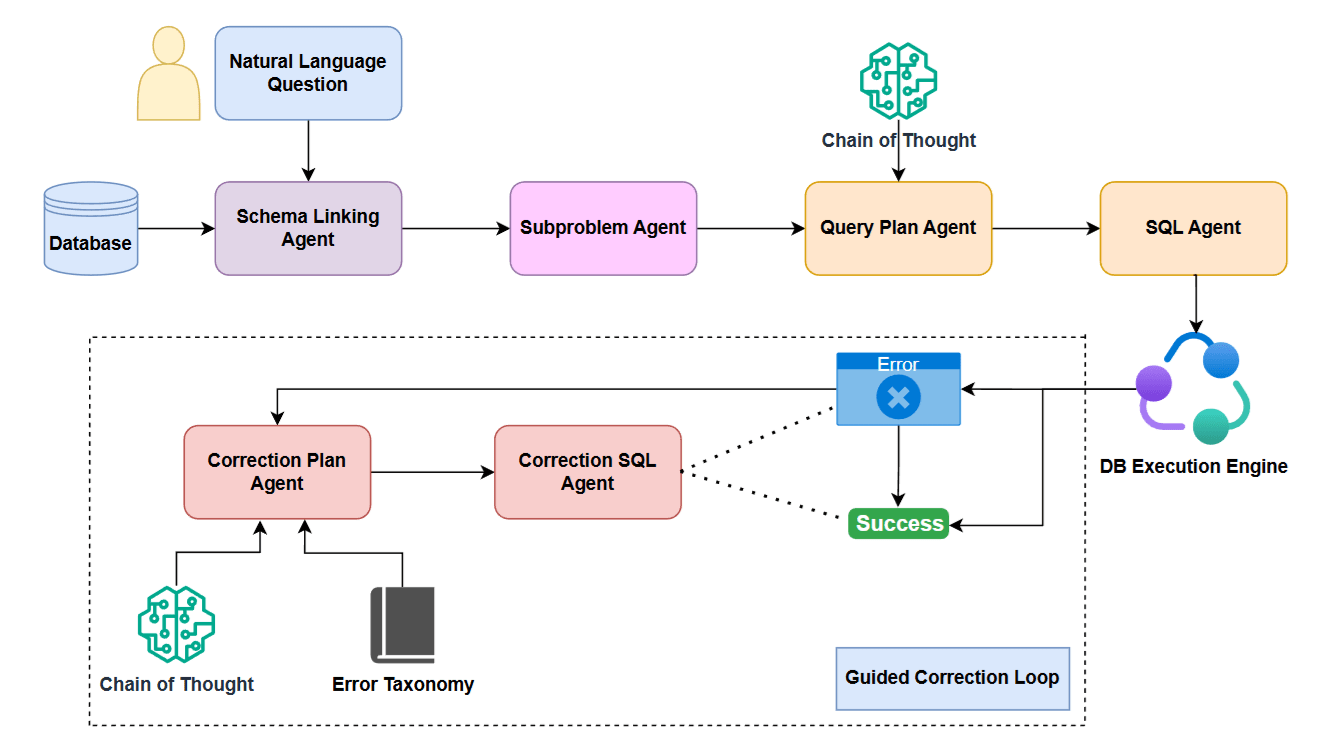 Correction SQL Agent: 基於 Correction Plan Agent 所提出的修正計畫,實際生成新的 SQL Code。與 SQL Agent 一樣,此 Agent 所產生的 SQL Code 會被 Database Engine 執行,若有錯誤則會回到 Correction Plan Agent 形成一個迴圈