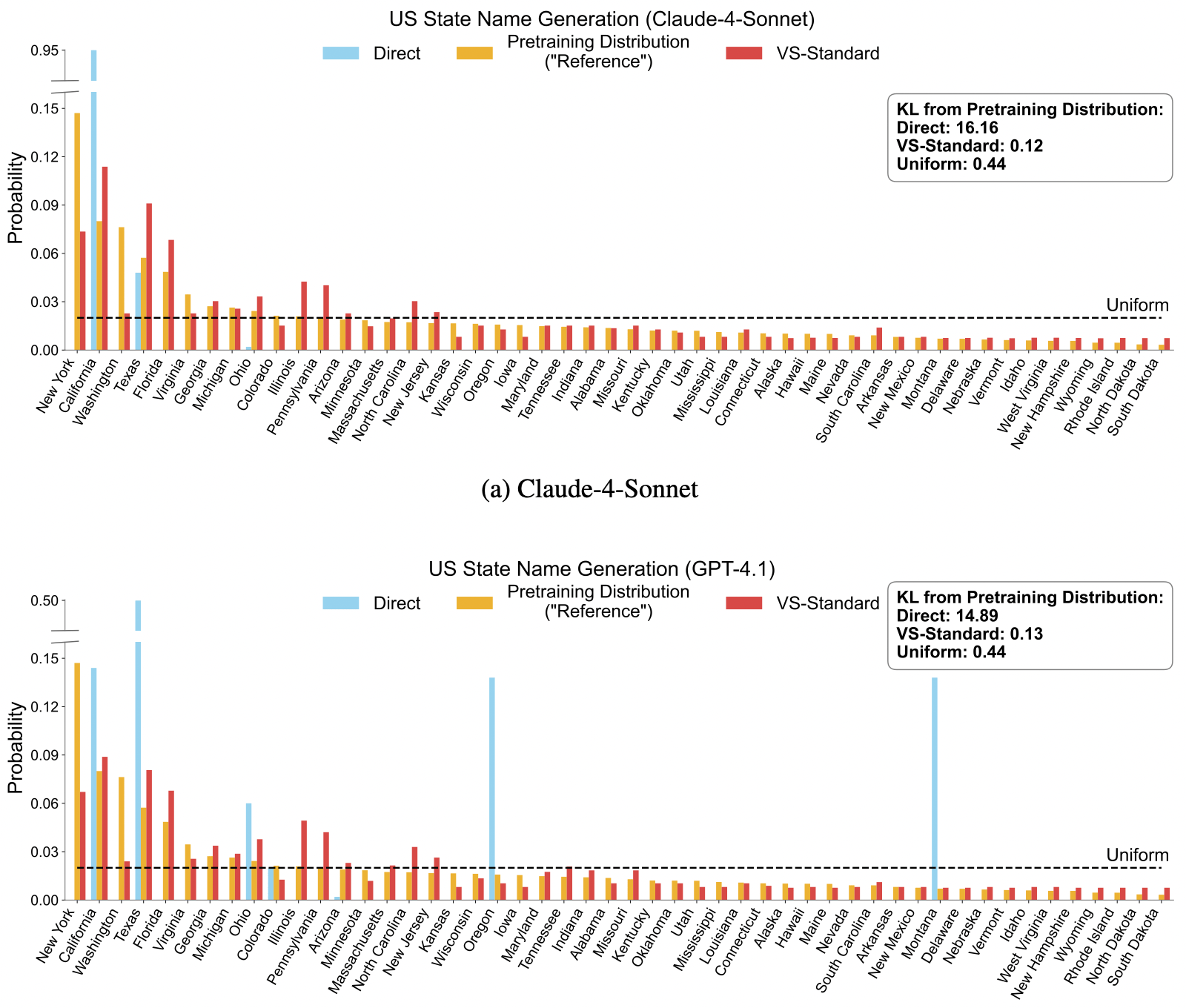 在 “Name a US State” 的實驗中,作者計算了生成分佈與真實預訓練數據分佈的 KL Divergence。